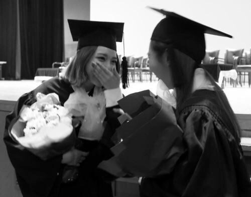 公开的照片中,带着学士帽、拿着花束的秀英和Yuri互相对视展露笑容,两人从练习生时期相识到现在10多年来同甘共苦在一起一直到大学毕业。