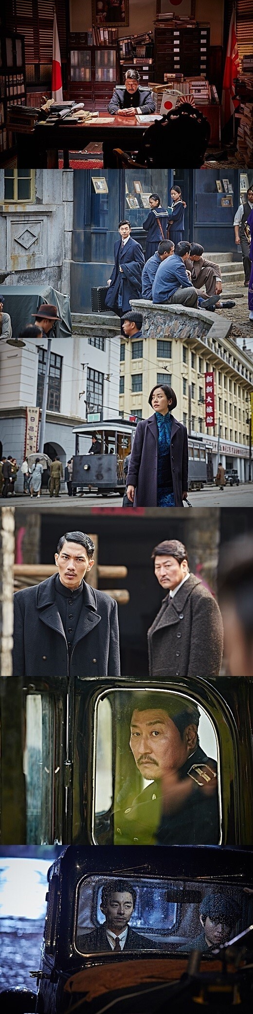 照片中,主演宋康昊、孔刘、申成禄、韩志玟等都以电影中的人物形象亮相,通过人物所处环境,大体也可以看出各自从事的工作。特别是,宋康昊饰演韩国人出身的日本警察李正出,孔刘饰演义烈团的新领导人金宇镇,立场完全不同的两人为什么会在暗夜里同行?难道两个人只是在互相打听对方的情报?给观众们留下了诸多疑问。在另外一组照片中,义烈团进行会议的场面充满了紧张的气氛。