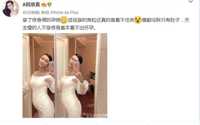 今天晚上,有翻版范冰冰之称的何承熹微博晒出孕肚照,“穿了修身裙的孕照,话说穿的宽松还真的是看不出来,哪都没胖只有肚子,天生瘦的人不穿修身基本看不出怀孕。”何承熹微博中写道。
