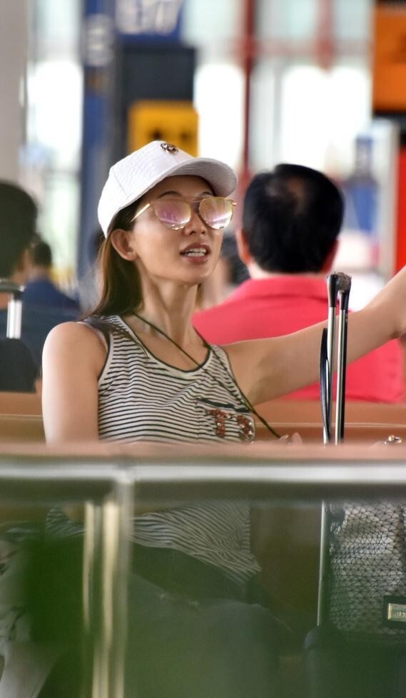 女神林志玲戴着鸭舌帽和墨镜,坐在候机厅椅子上玩手机,外套也脱在了一旁。