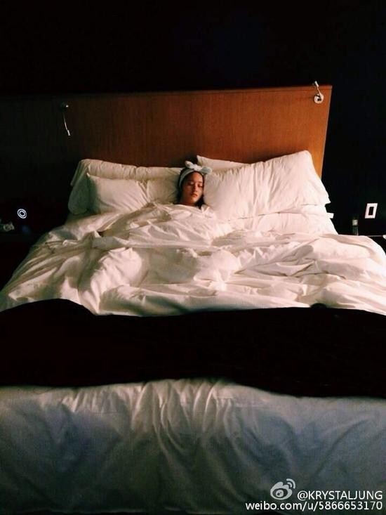 3月12日深夜,韩国组合f(x)成员郑秀晶(Krystal)在微博晒睡照,并跟大家道晚安:“Sleep like me, 晚安!”照片中Krystal戴着白色蝴蝶结发箍,把头放在两个枕头中间,静静地躺在白色偌大的床上,显得身躯十分娇小,睡容十分可爱。网友纷纷点赞:“哇偶,原来发型弄成这样也依然可爱。”“你也好喜欢睡两个枕头中间辣个坑,爱你!”也不禁好奇:“谁拍的?我也想看你入睡。”