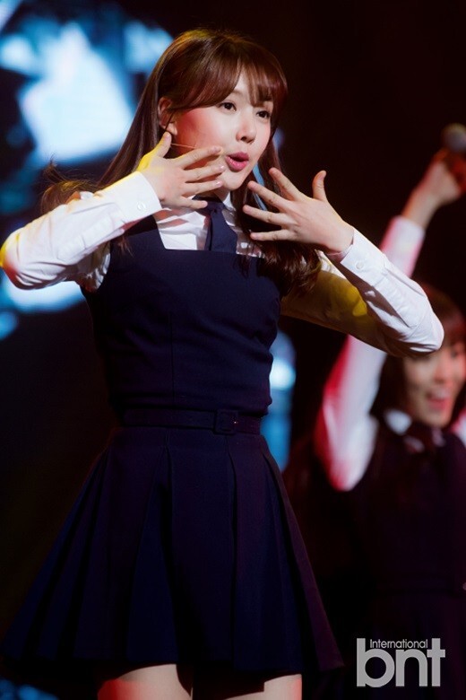 25日下午,韩国女子组合GFRIEND第三张迷你专辑《Snowflake》showcase在首尔广津区axhalkorea内举行,成员们身穿蓝色背带短裙载歌载舞,舞台上活力四射尽显青春魅力。