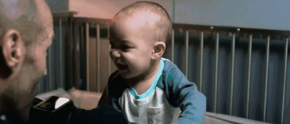 为了baby不受枪声惊吓,戴克肖给孩子戴上了耳机。每次打斗完毕后,戴克肖都会逗一下孩子,而小可爱直接回馈以美妙的孩童微笑~
