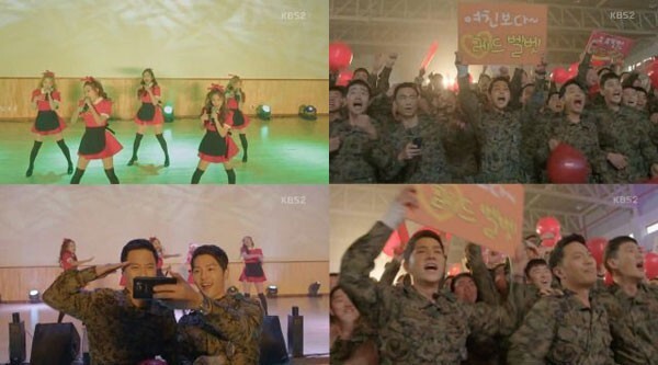 在 Red Velvet 表演过程中,除了士兵们的热情应援外,宋仲基、晋久饰演的刘时镇、徐大英也瞬间化身成为「大叔粉丝」,挥舞写着「比起女友,更爱 Red Velvet」、「比起天使,更爱 Red Velvet」的字卡与气球喊应援,甚至拿出手机自拍。而晋久则是随着旋律摆动身体,这两位大叔粉丝真的是相当可爱呢!