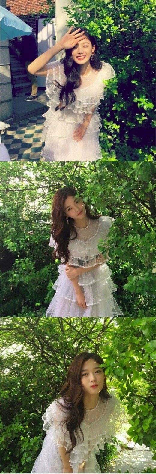 公开的照片中,金裕贞绿色的大树为背景,身穿白色的连衣裙,摆出各种姿势和表情。