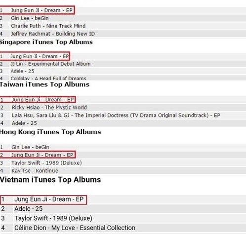 4月18日,韩国女团Apink成员郑恩地的新专辑《Dream》音源在各大音源网站公开,主打曲《希望的天空(hopefully sky)》登顶各大音源网站的实时排行榜。同时,专辑《Dream》也位列新加坡、马来西亚、越南等5个国家和地区的iTunes专辑排行榜榜首。