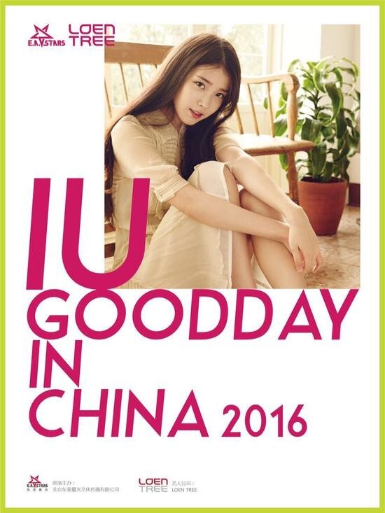 韩国女歌手IU(李知恩)今日通过主办方北京东亚星光宣布,将于2016年下半年相继在广州、长沙、南京、重庆、武汉等地展开名为“Good Day in China 2016”的中国巡演。本次中国巡演IU将以音乐分享会的形式跟大家一起欣赏她的音乐,现场除了歌曲演唱还将加入更多环节,让歌迷可以对IU有更深入的了解。据悉,此次中国巡演,不仅IU将演绎十多首经典曲目,还有为歌迷精心准备的中文歌曲,作为献给中国歌迷的特殊礼物。