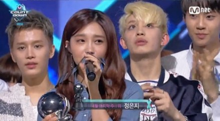 韩国女子组合Apink成员郑恩地凭借SOLO新曲取得音乐节目冠军,捧奖杯激动。